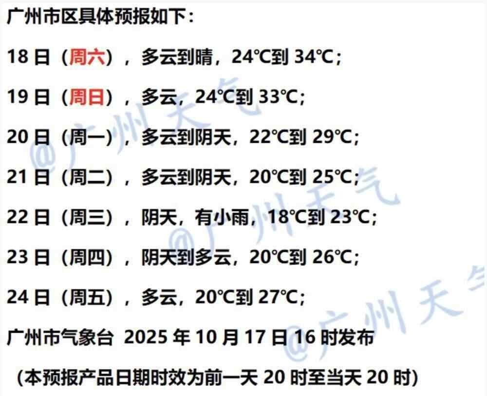 广州市气象台10月17日预计,18日至19日白天,广州多云间晴,最高气温34℃左右。预计19日夜间起,受中等强度冷空气和海上热带系统(台风)共同影响,广州日平均气温逐渐下降,陆地阵风加大至5~7级,港区和高地阵风6~9级,预计22日早晨,广州市区将出现18℃的过程最低气温。展望23日起,广州天气以多云为主,气温回升。